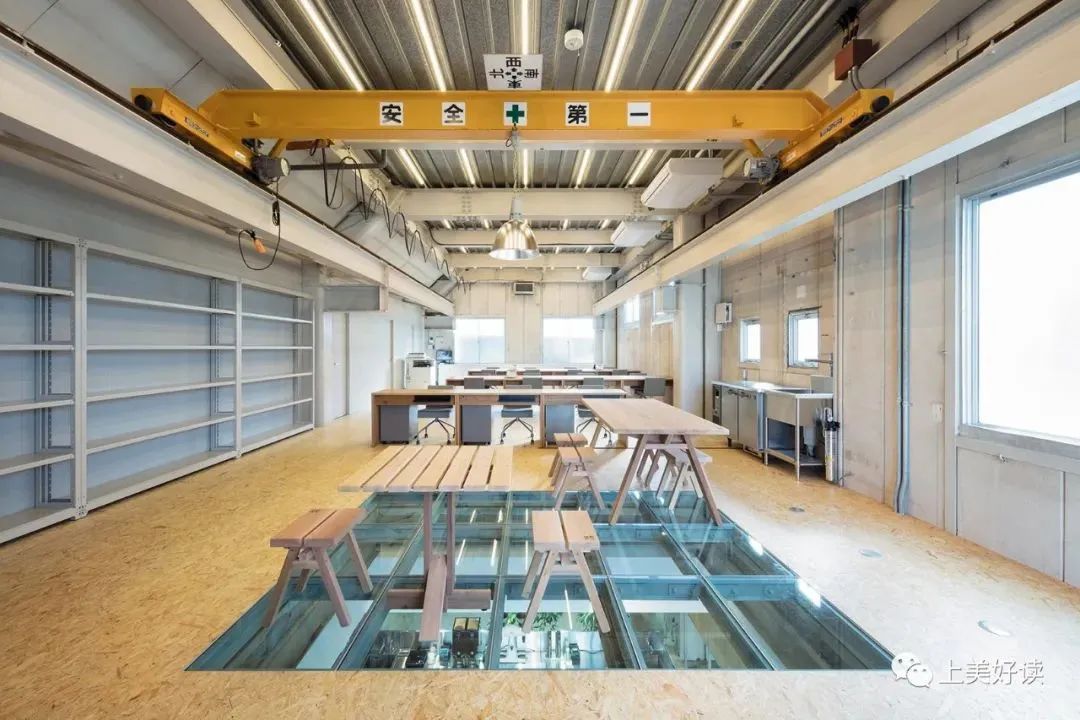 这个多层建筑物充分利用了既有建筑的特征,处于建筑内部的人能够意识到彼此之间的存在。由于它是工厂旧址,在设计中使用了原有的吊车,同时为了方便吊车上下作业,二层地面开了洞,原本的半地下空间则设计成储存材料的仓库。