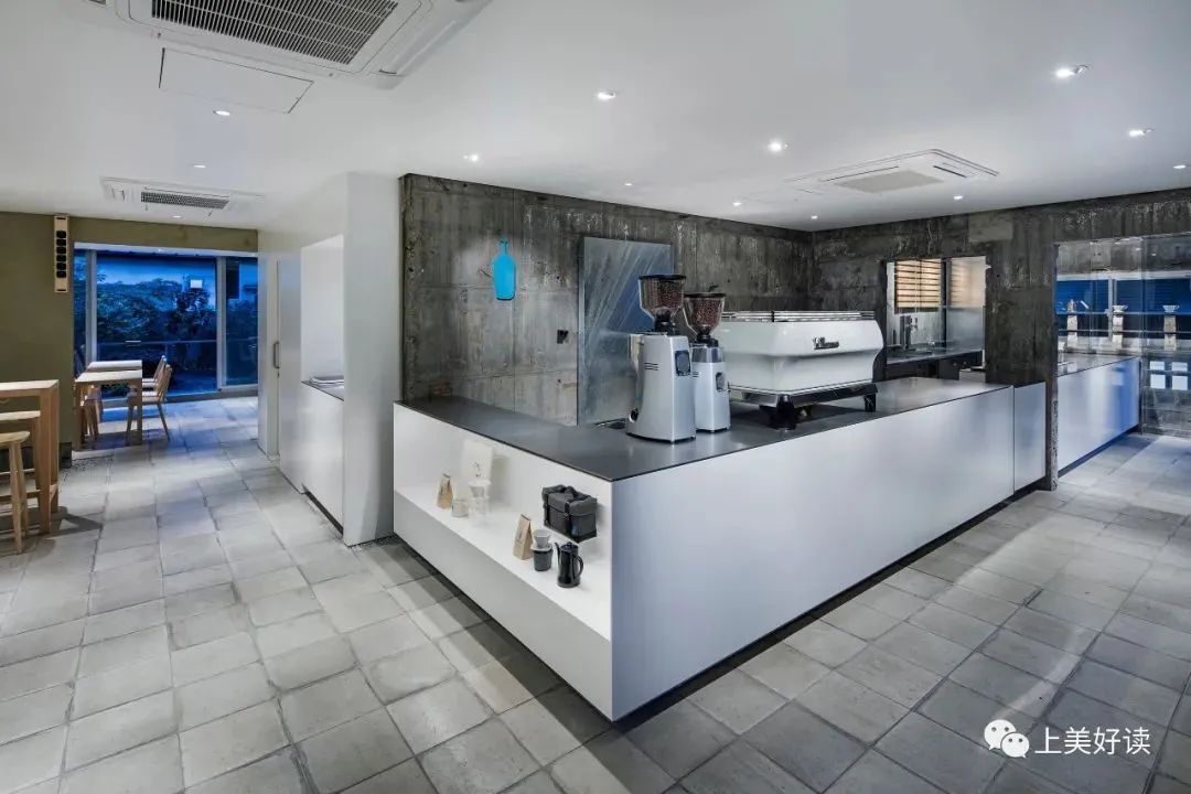 长坂:第一次接到蓝瓶咖啡的设计工作时,我还不太了解第三波咖啡浪潮。当我去旧金山、洛杉矶考察,才慢慢理解蓝瓶咖啡想要表达的东西。蓝瓶咖啡最关注的并不是事物与事物之间的主从关系,在他们看来,采摘咖啡豆的人、烘焙咖啡豆的人、冲咖啡的人以及客人之间的关系是平等的。能够让喜欢咖啡的人聚到一起的环境,是主创团队最乐于看到的。理解了这一点之后,我开始考虑如何把这种关系“翻译”成具体的空间。例如厨房部分一定会有防水施工,如果用普通的施工方法,厨房地板的完成面会变高,不过我们没有采用传统的做法,而是尽量做出不让视线升高的设计方案。换言之,我们尽量让柜台内的工作人员和客人的站立高度齐平,以尽量避免双方之间出现视线的高度差。