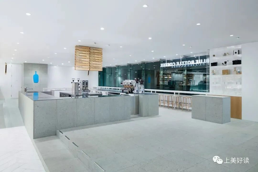 厨房区的地下需要排布进出水的管道,通常需要抬高地面。而在这次设计中为了强调消费者与店员之间的“对等”关系,我们特意把整个饮用区座位的地面也相应地抬高了。这是蓝瓶咖啡首个运用石板材料打造的空间。