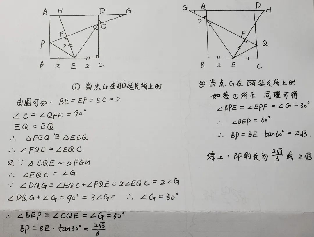 11.如下图所示,已知正方形ABCD的边长为4,点E为BC的中点,点P为AB上一动点,沿PE翻折△BPE得到△FPE,直线PF交CD边于点Q,交直线AD于点G.连接EQ,延长EF交直线AD于点好.若△CQE与△FGH相似,求BP的长.