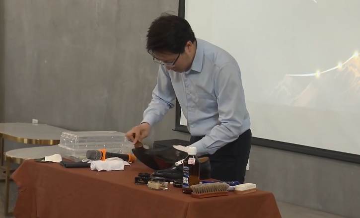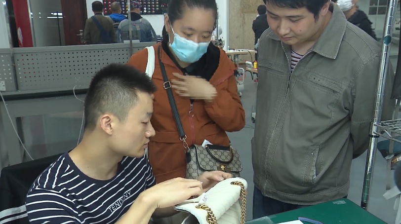 正在讲解的是皮具修护的高级技师叶黎松。来自殷行社区的待业青年王女士,在惠奢专业奢侈品维修保养工厂看到叶师傅正在修复一款白色古驰包,技术娴熟,觉得非常“神奇”。