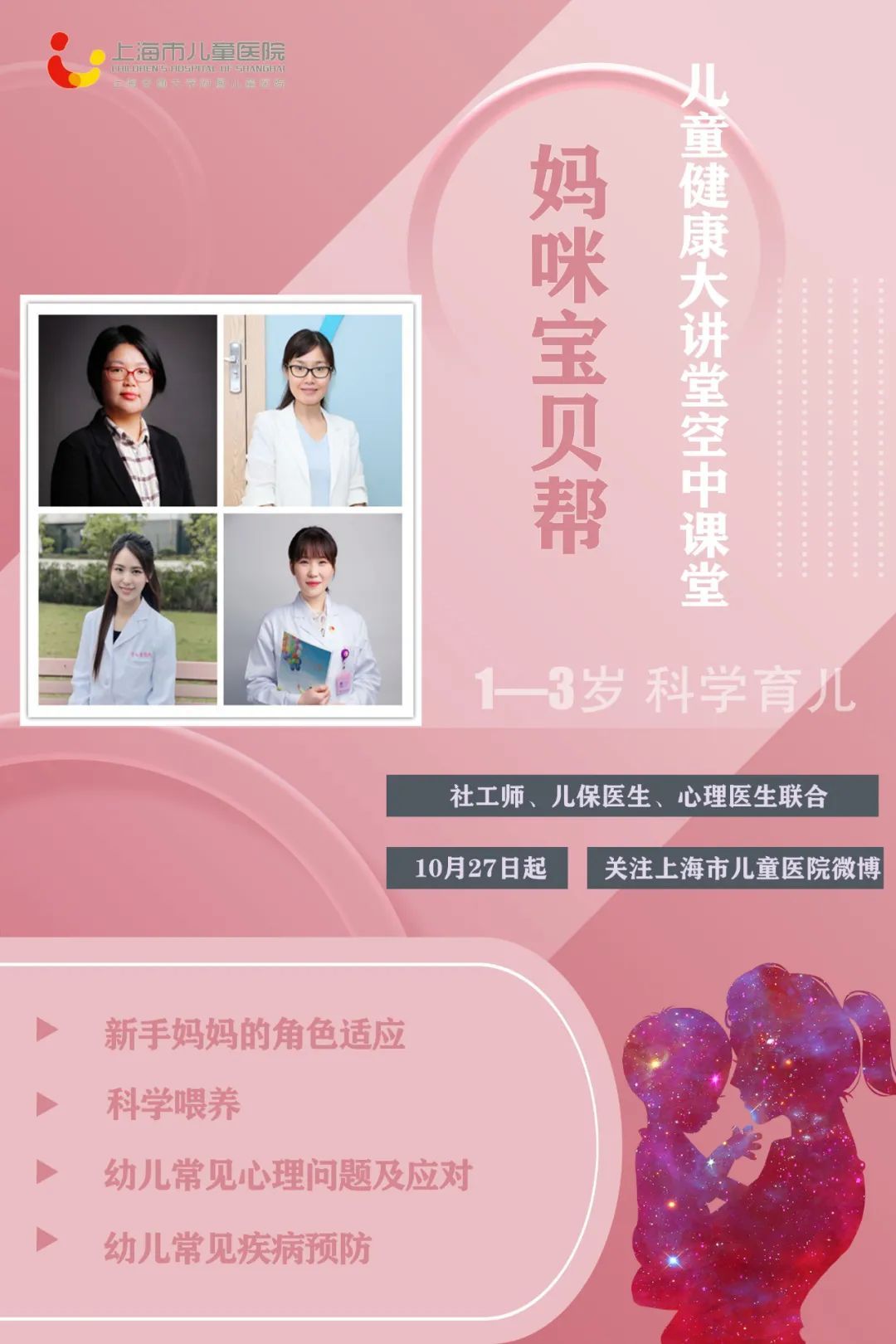 我们旨在通过线上育儿讲座向1-3岁儿童家长普及新手妈妈角色适应指导、传递科学喂养知识和常见疾病预防知识、幼儿常见心理问题及应对技巧,帮助您在育儿过程中获得家庭支持,以期在自身和家庭育儿过程中得到全方位成长,促进您的家庭氛围和谐~