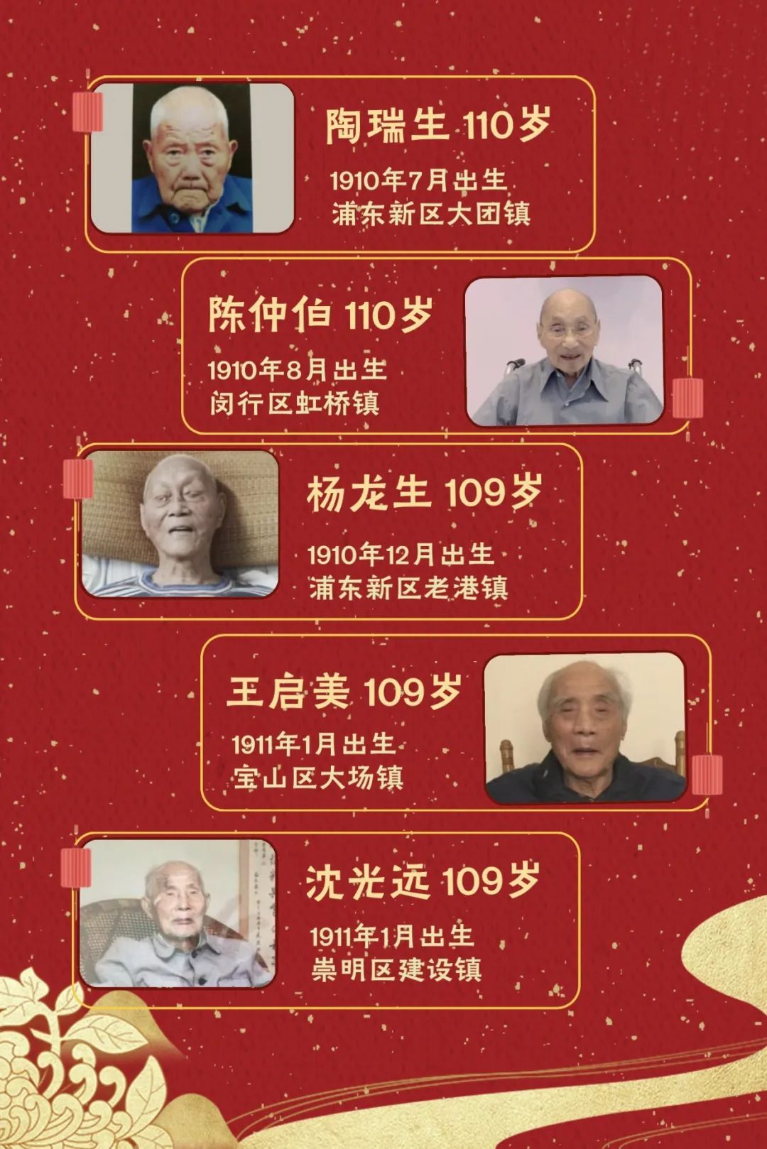 1、陶瑞生(110岁,浦东新区大团镇)