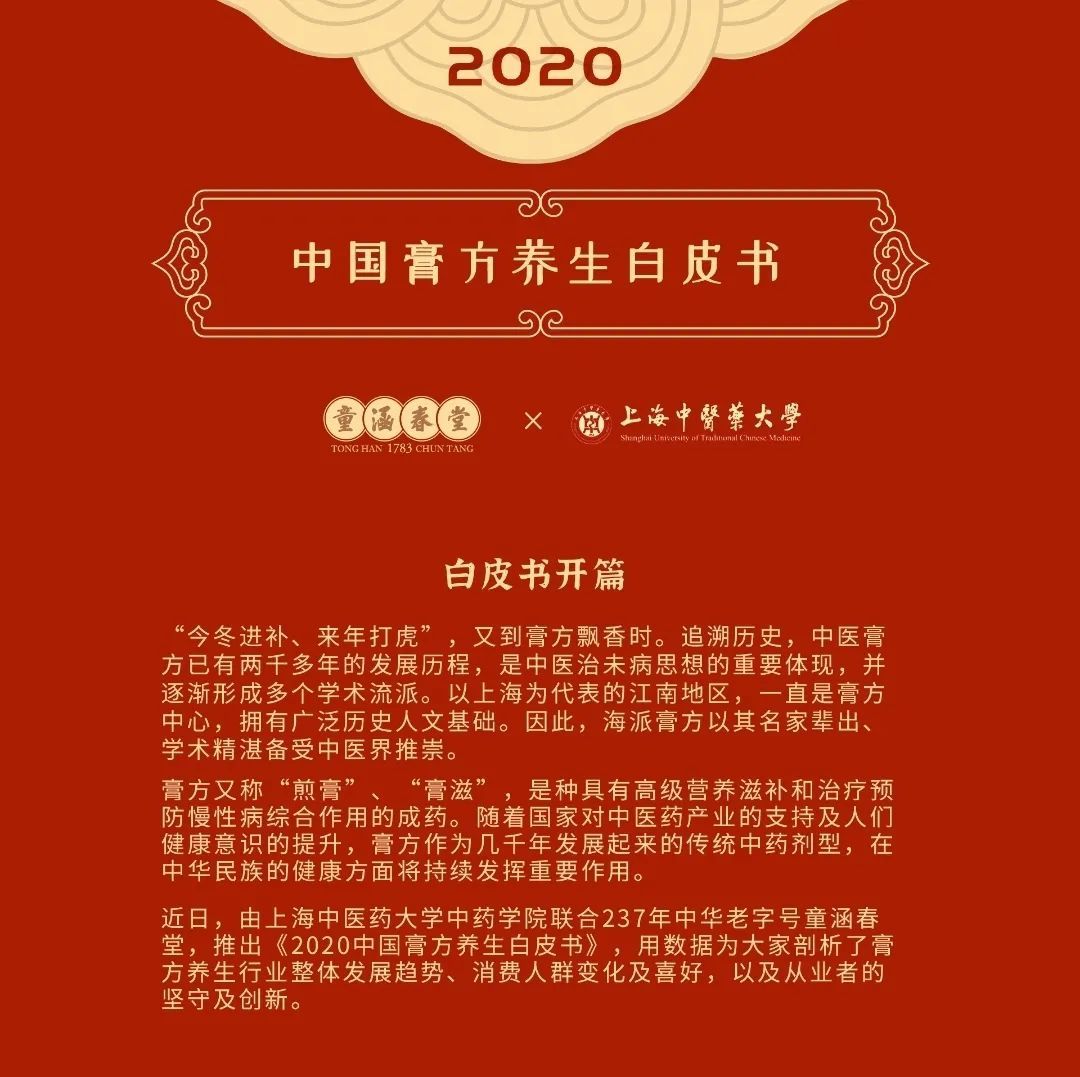 童涵春堂还联合上海中医药大学中药学院推出《2020膏方养生白皮书》,进一步奠定了这家老字号在市民心中良好的商誉与口碑。