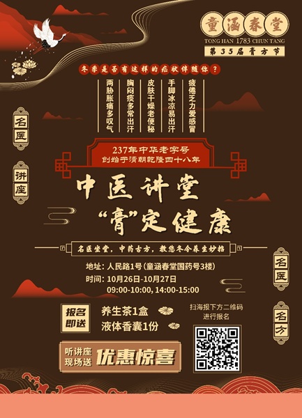 为了更好地普及膏方文化,在10月26日、10月27日上午8:30-11:00,童涵春堂将联合福牌阿胶,在人民路1号童涵春堂国药号推出【中医讲堂,“膏”定健康】免费义诊讲座,邀请知名中医专家为上海市民进行一对一量身定制服务,并且贴心地为消费者准备了不少礼品和优惠,消费者可通过童涵春堂官方微信等渠道预约报名。