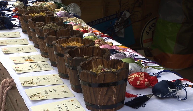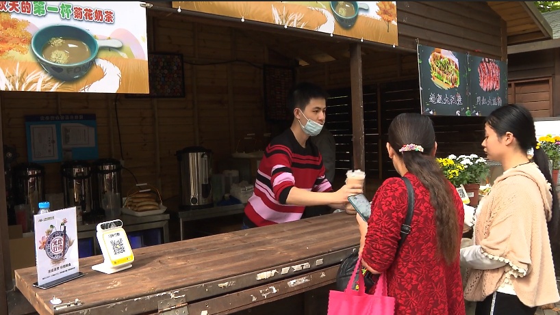 今年菊展的特色产品也别出心裁,比如有“秋天的第一杯菊花奶茶”,还有制作精美的菊花香囊……对于想带点菊展纪念物回家的游客们,都是不错的选择。