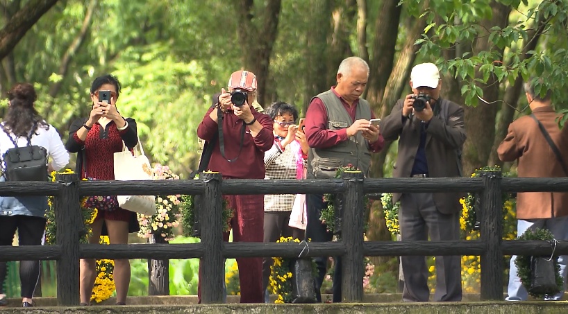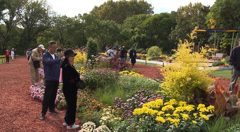 在蓝天的映衬下,色彩缤纷的菊花让前来打卡游园的游客们流连忘返。尤其是喜欢拍照的市民,更是戴好丝巾、穿着合体的衣服,在各色菊花前留下美好瞬间。