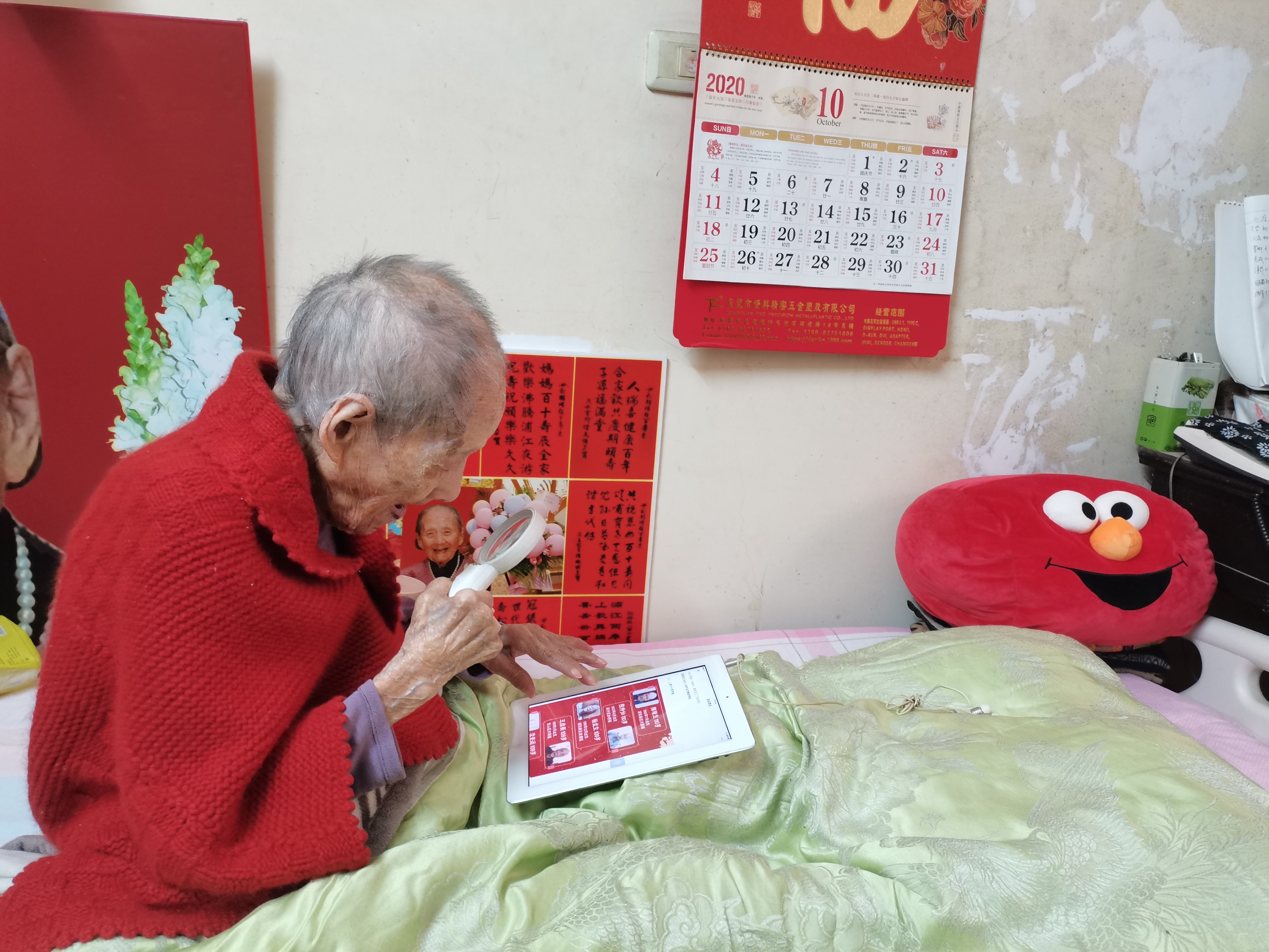 昨天下午3点多,在吴志成老人家,刚刚午睡起来的吴阿婆拿出床边的IPAD,再拿起手边的一个放大镜,随后点开了微信,打开了有着40多位家庭成员的“卞家大院”群,当看到群里分享的照片、短视频后,老人眼神非常地专注,和女儿说说话,一边看着照片,一边笑得合不拢嘴。