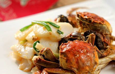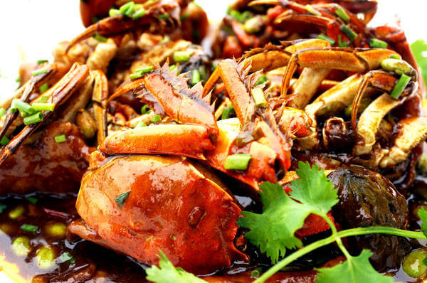蟹炒年糕:将清水蟹洗净斩成对块用淀粉拌之,油炸成金黄色,伴以年糕薄片炒熟,至于配料因人口味而已,或香辣或咸鲜或葱香,任君选择。这道菜,蟹块香脆爽口,年糕片带着嚼劲带着蟹香,据说是上海人最爱的蟹菜之一!