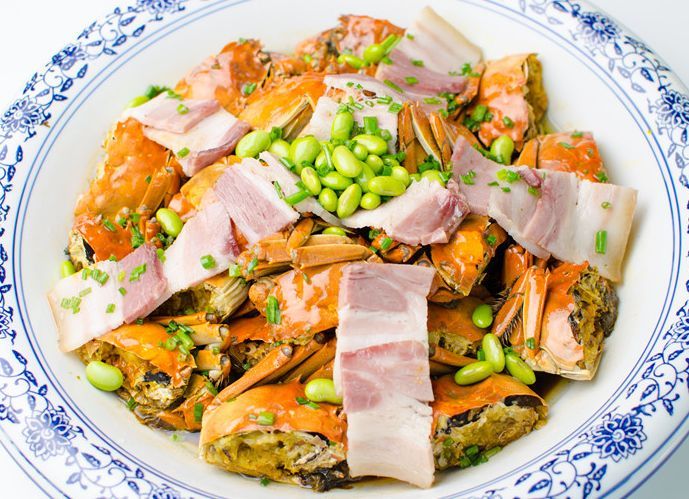 咸肉蒸螃蟹:大概是螃蟹吃法的新宠。也是将其一切二,不同的却是保留完整的蟹盖,用以蒸制时扣住切片的咸肉。然后伴以葱、姜、高汤和油,再加几粒崇明人喜爱的毛豆,大火十分钟的清蒸后,红的更红了,绿的更绿了,一道色鲜味俱全的咸肉蒸螃蟹可以开吃了。