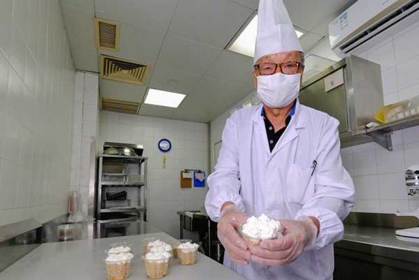 1959年对应关葆来说,是极具纪念意义的一年。初中毕业的他,被分配了如今的衡山宾馆,跟着衡山宾馆一路成长,赢得国人乃至外宾的好评。栗子蛋糕很甜,栗子粉软糯香甜,入口回味无穷,但做栗子蛋糕其实很苦,当年每一步都要靠手工制作,早起磨栗子粉是一件必须持之以恒的“苦差事”。但他在对食客口味进行了充分研究,对配方加以自己的理解、改良的基础上,一路稳扎稳打走了下来,一路走到退休返聘,直至走到今天,他还在制作栗子蛋糕。