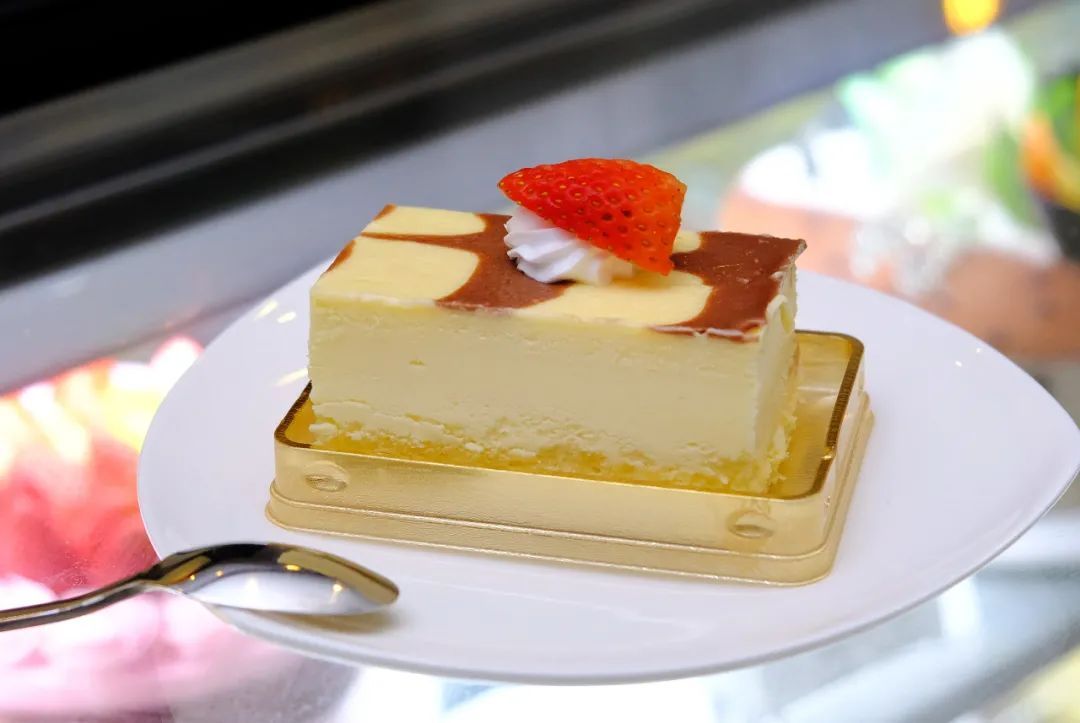 花纹如同大理石的芝士蛋糕,则口感厚重扎实,散发着甜蜜诱人的芝士味儿,却又不会过分发腻,非常适合搭配一杯微苦的咖啡,静坐在衡山宾馆里,闲度午后时光。