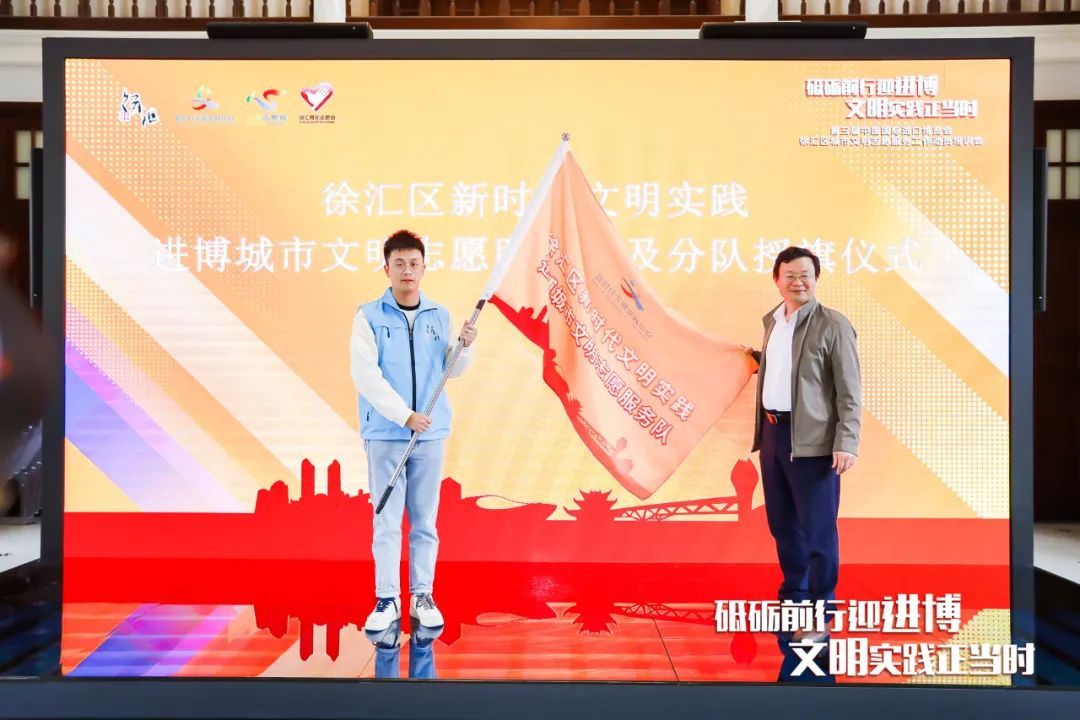 ▲区委宣传部副部长何明星和团区委副书记、党组书记陆璟琨为徐汇区新时代文明实践进博城市文明志愿服务分队授旗
