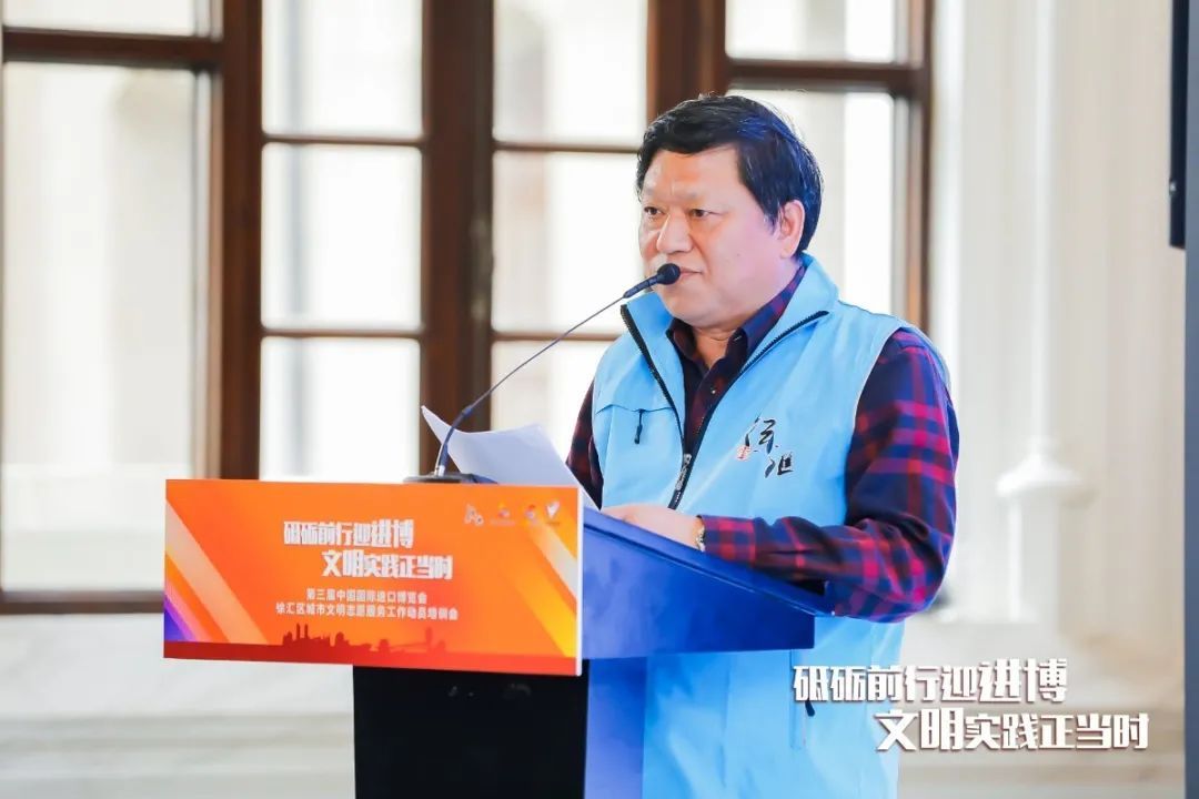 ▲区委宣传部副部长何明星为徐汇区新时代文明实践进博城市文明志愿服务队授旗