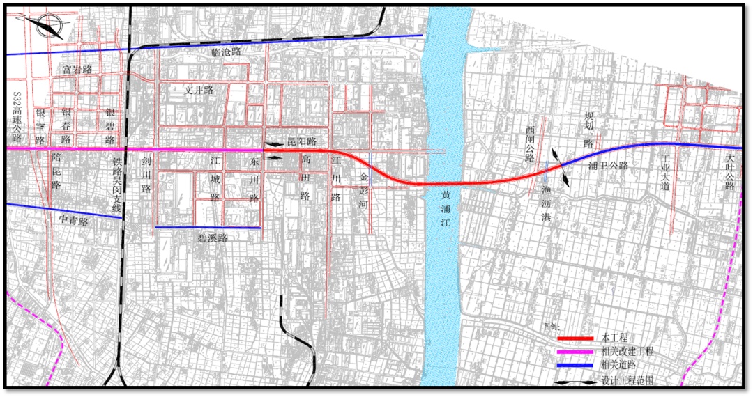 工程北起闵行区东川路,跨越黄浦江后在西闸公路以北落地,终点与奉贤区浦卫公路改建工程衔接,全长约3.49公里,其中,越江大桥部分长约1.94公里,主桥设计为独塔斜拉桥。