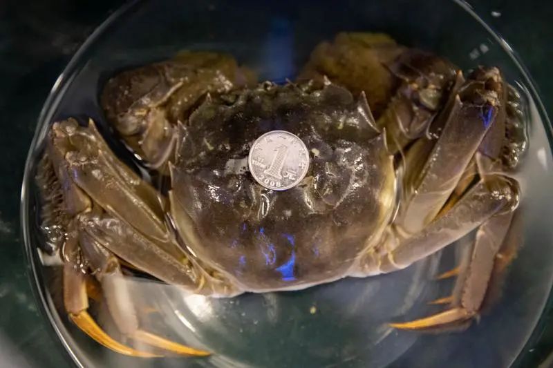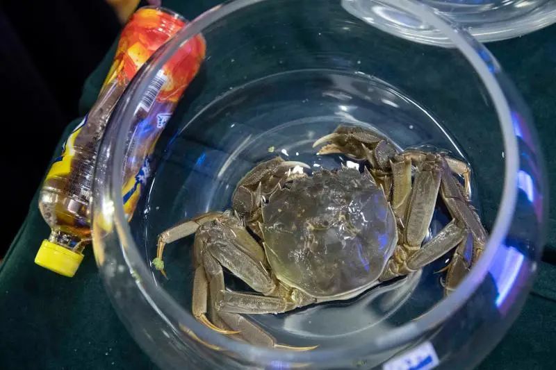 一只参与蟹王蟹后角逐的河蟹体长接近一个饮料瓶