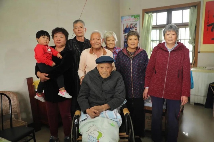 老人早已经实现了“五代同堂”,第五代最大的孩子,已经在读大学了。重阳节前夕,大团镇政府工作人员前来看望老人,还为他拍了一张五代同堂的照片。