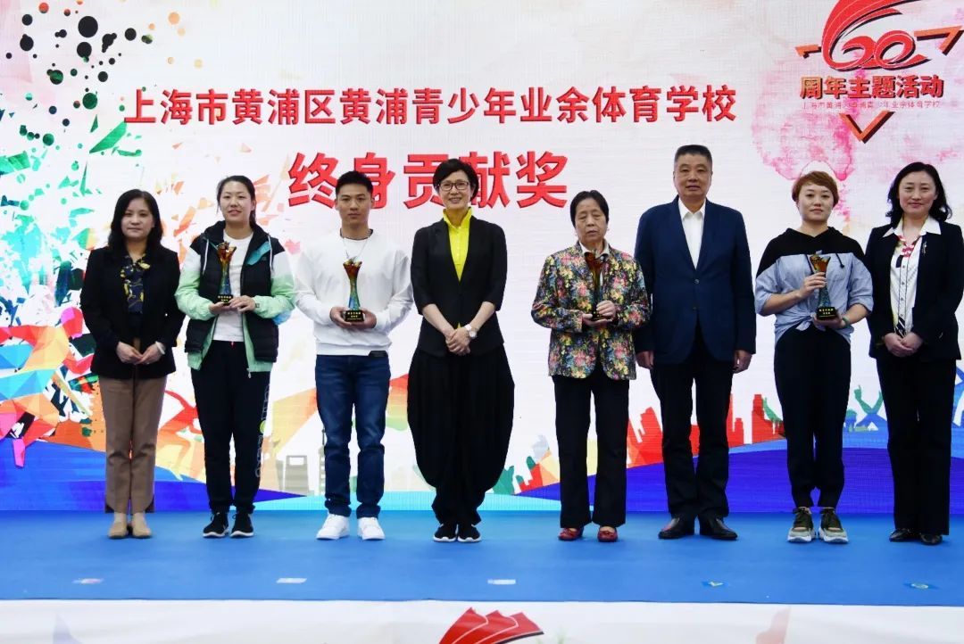 市体育局二级巡视员杨培刚,黄浦区副区长李原等为朱建华启蒙教练胡鸿飞、陶璐娜启蒙教练翁绍信、火亮启蒙教练李秉鹤、孙雯启蒙教练杨泽润颁发“终身贡献奖”
