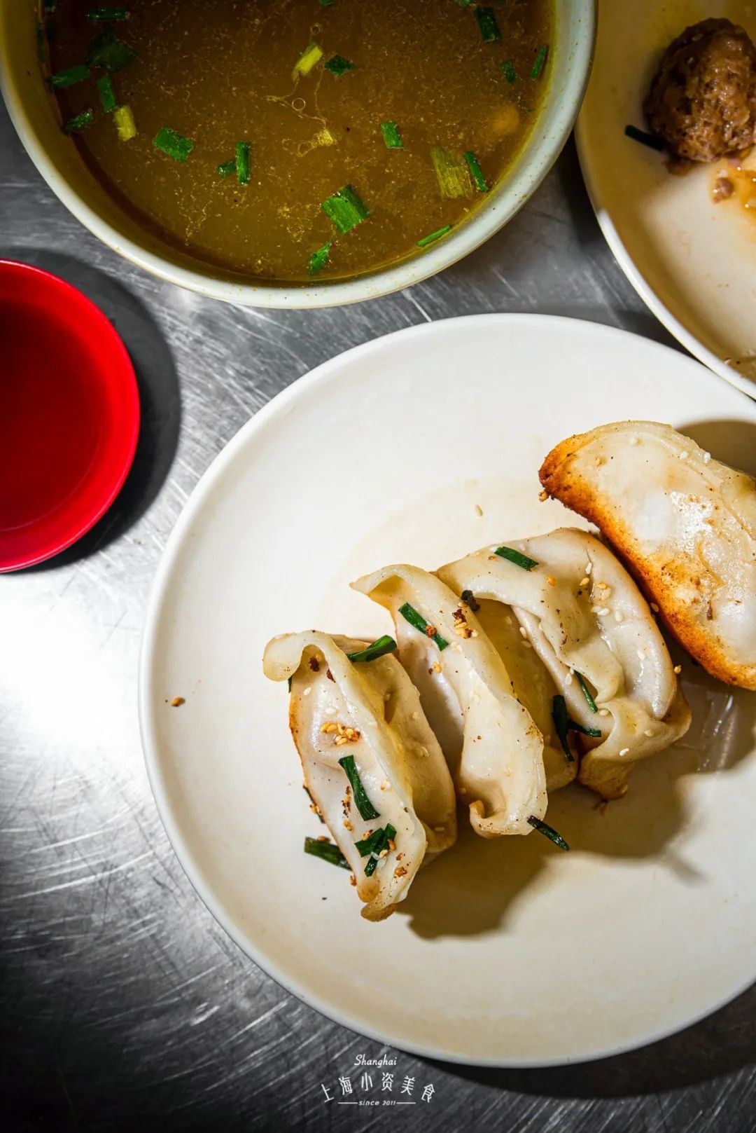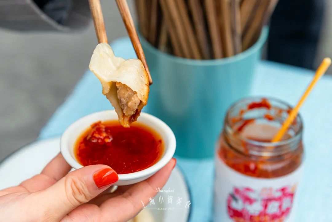 锅贴比别家更好吃的秘籍,在于独家自制的辣酱,属于上海人喜欢的香辣。舀上一勺加在醋里,也不会盖过锅贴的本味。