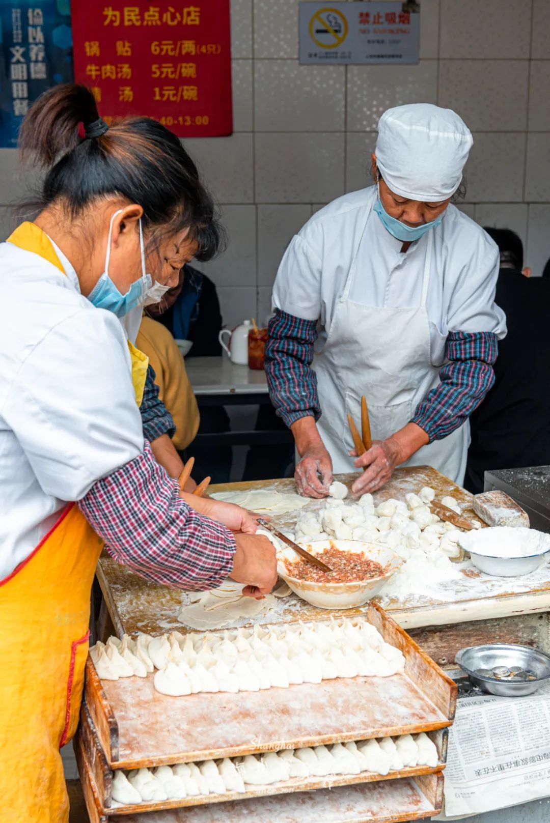 经营小店的是几位上海阿姨,包锅贴的手速相当老练。不少老吃客就是冲着阿姨们用料讲究实在,甚至不惜从虹桥赶来,也要尝这一口。