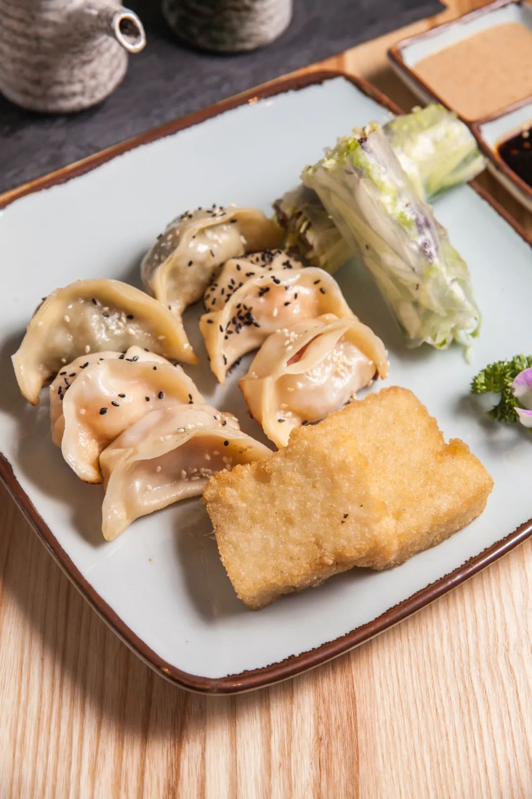 一份综合锅贴,涵盖了鲜肉、鲜蔬、羊肉等不少口味,还搭配了粢饭糕,创意十足。
