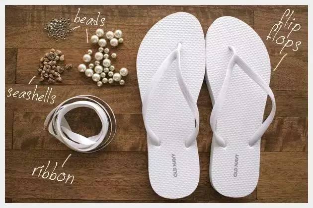 准备一双白色的人字拖,装饰珍珠25颗左右,贝壳数颗,小珠子数颗,缎带1卷。