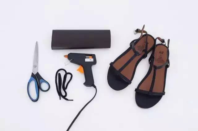 准备旧凉鞋、黑色仿皮、剪刀、喷胶枪、绳子。