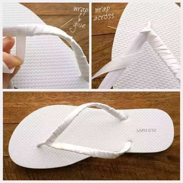普通拖鞋有点单调?想来点不一样的?这可能是最简单最快速的装饰方法了。准备彩带和剪刀