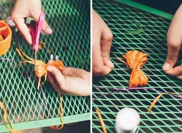 将流苏围绕绳子卷起,粘合,将两条流苏挂饰穿在一条小绳子上,再绑在凉拖上即可。