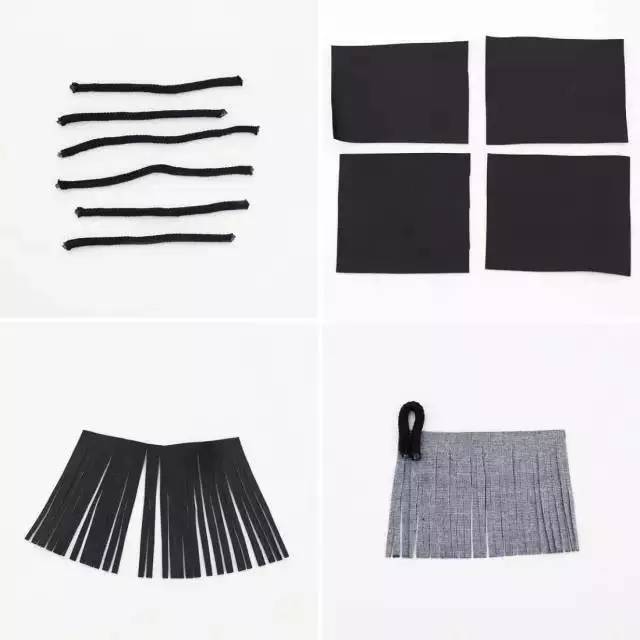 将绳子剪成6小段,将仿皮布裁成3cm×4cm的大小 然后如图所示剪成一条条的流苏,再把小绳子做成勾状,粘在背面。