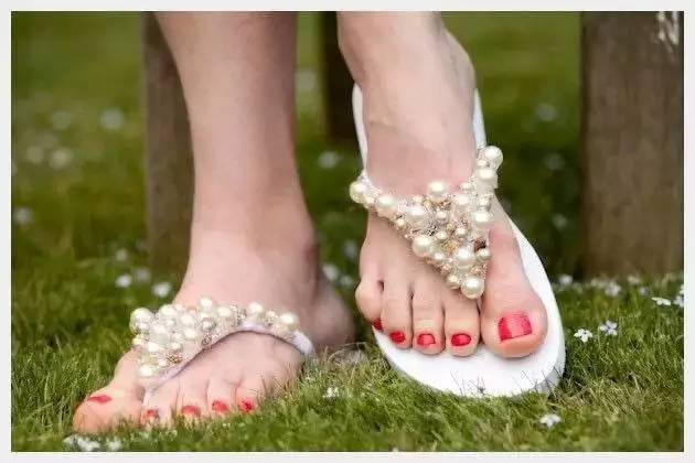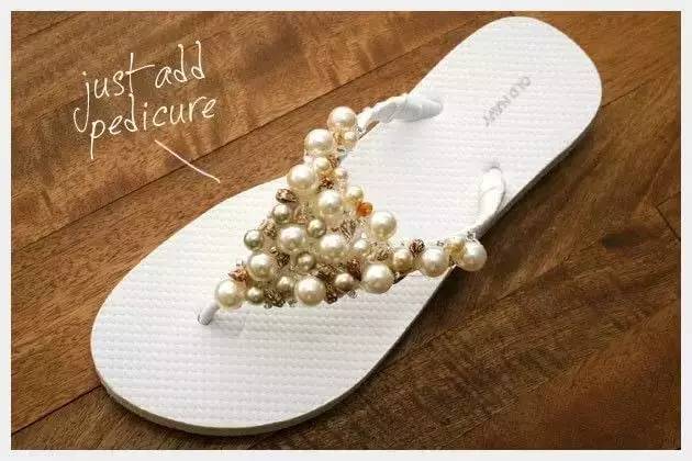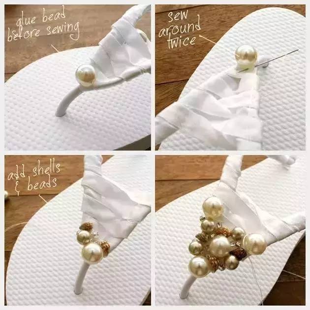 缝好后,一双普普通通的人字拖就完美变身成女人味十足的淡雅珍珠凉拖了。