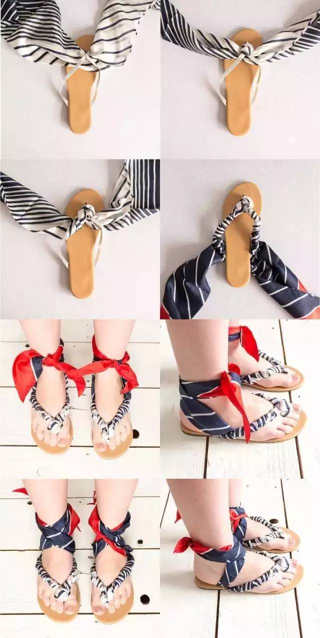 准备一双人字拖,一条条纹款丝巾。如果所示,将丝巾从夹脚处开始缠绕,然后沿着拖鞋带两边缠绕,多出来的两段则系在脚踝处。一双今夏潮爆的海军风脚踝绑带款凉拖就完成了。