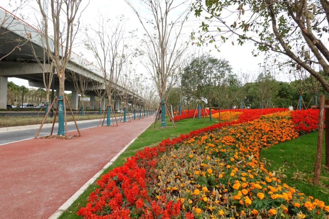 本次率先竣工段为龙东大道内环至中环段地面道路(含两侧绿带),全长4.4公里,采用双向6快2慢车道布局。此次与道路施工同步完成的道路两侧绿化种植共计18万平方米。