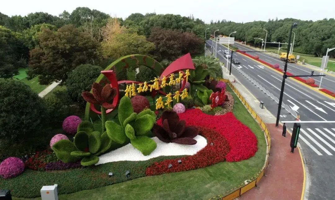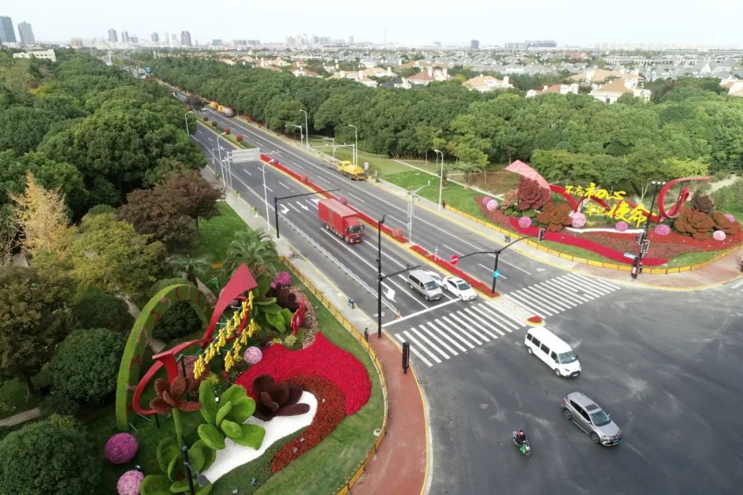 作为张江科学城的北大门,龙东大道金科路口此次配合进博会保障,专门打造了转角节点景观,四个路口采用了彩色人行步道,在路口南侧铺设草花,种植桂花树,形成集视觉、嗅觉于一体的城市风景线。