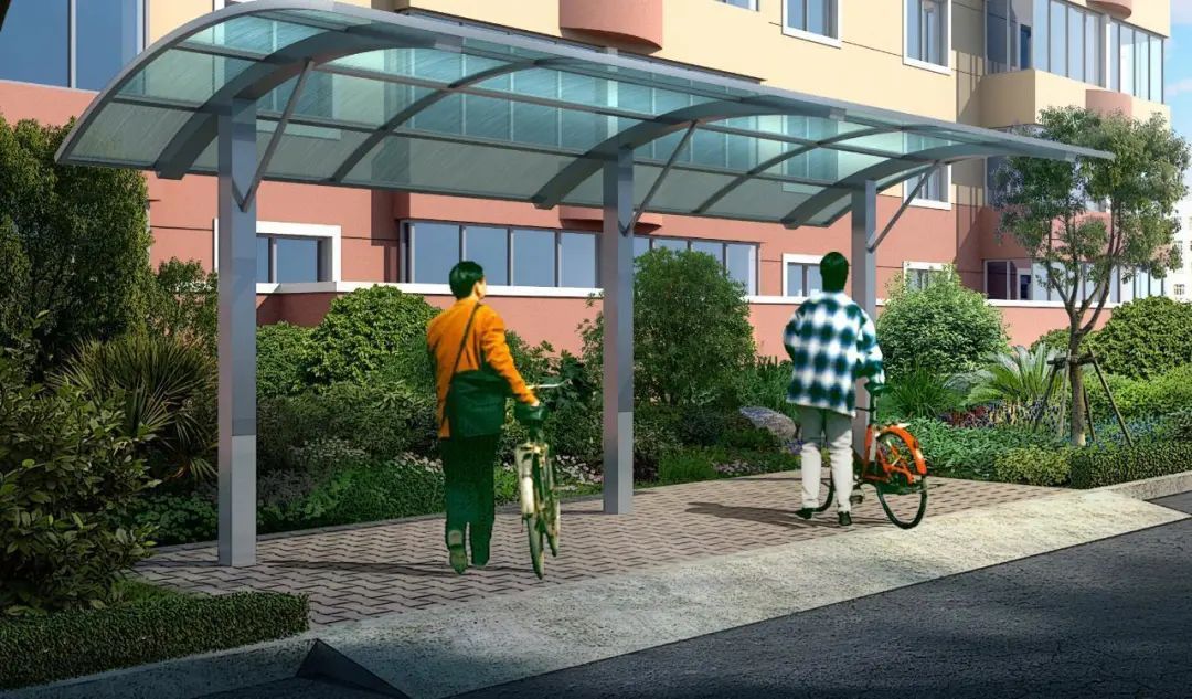 小区北侧、南侧以及中间均设有非机动车停车棚,换新的车棚将增设智能充电设施、简易喷淋设备和刷卡门禁系统。