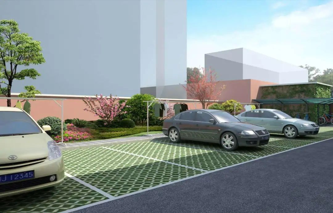 小区现有景观绿地狭小,同时要兼顾居民的停车、晾晒的需求。方案规划了植草停车位、晾衣架以及非机动车棚。