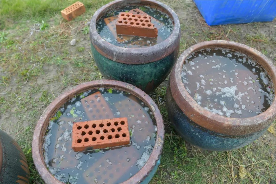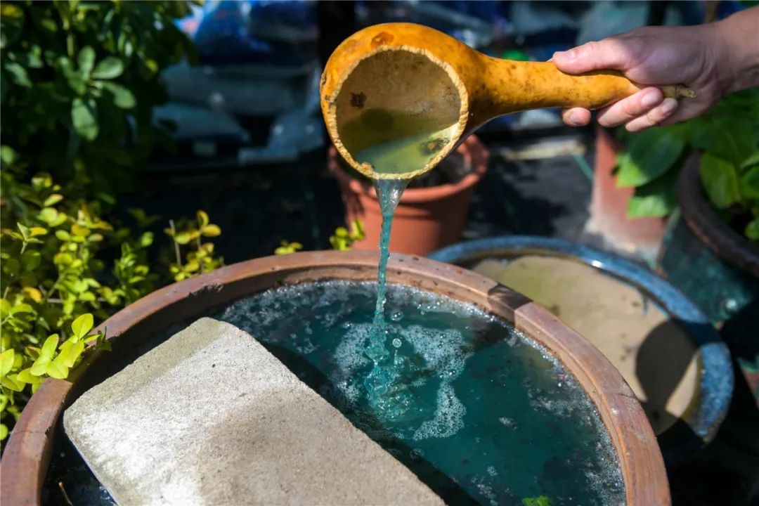 易帅说,收割后的蓼蓝要放在水缸中加水浸泡2-3天,等颜色翻青之后,再把青色水沥清后沉淀2-3天。在爱普香料园内可以看到,20多口陶瓷水缸全部浸满了蓼蓝,缸口处用砖头压着,与过去农家腌咸菜的场面有些类似。