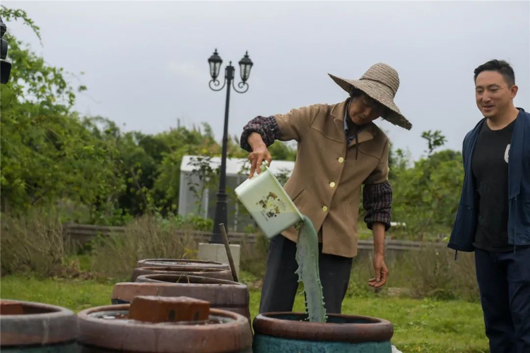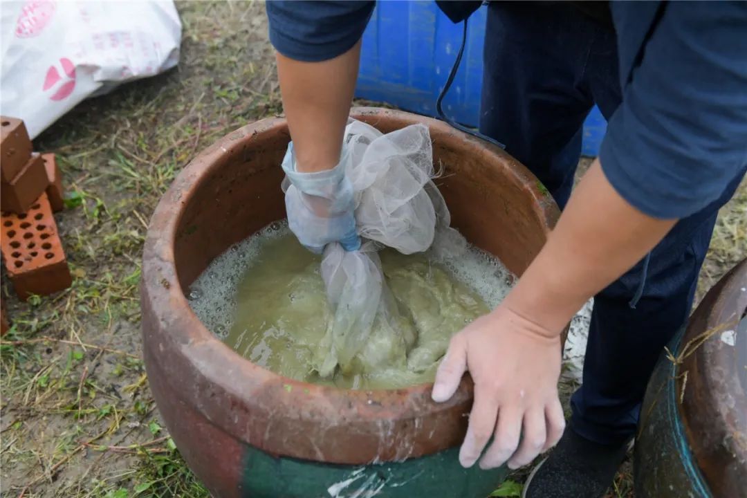 沉淀完毕后,就要往缸内加入石灰混合,爱普香料植物园经理章斌卿向小嘉展示了这一步骤。他先按比例将石灰倒入纱网,再将纱网放入水缸顺时针搅拌,直至纱网中的石灰全部溶解于水中。这时,石灰会把水中的青色吸附,水面犹如污浊的泥浆水。