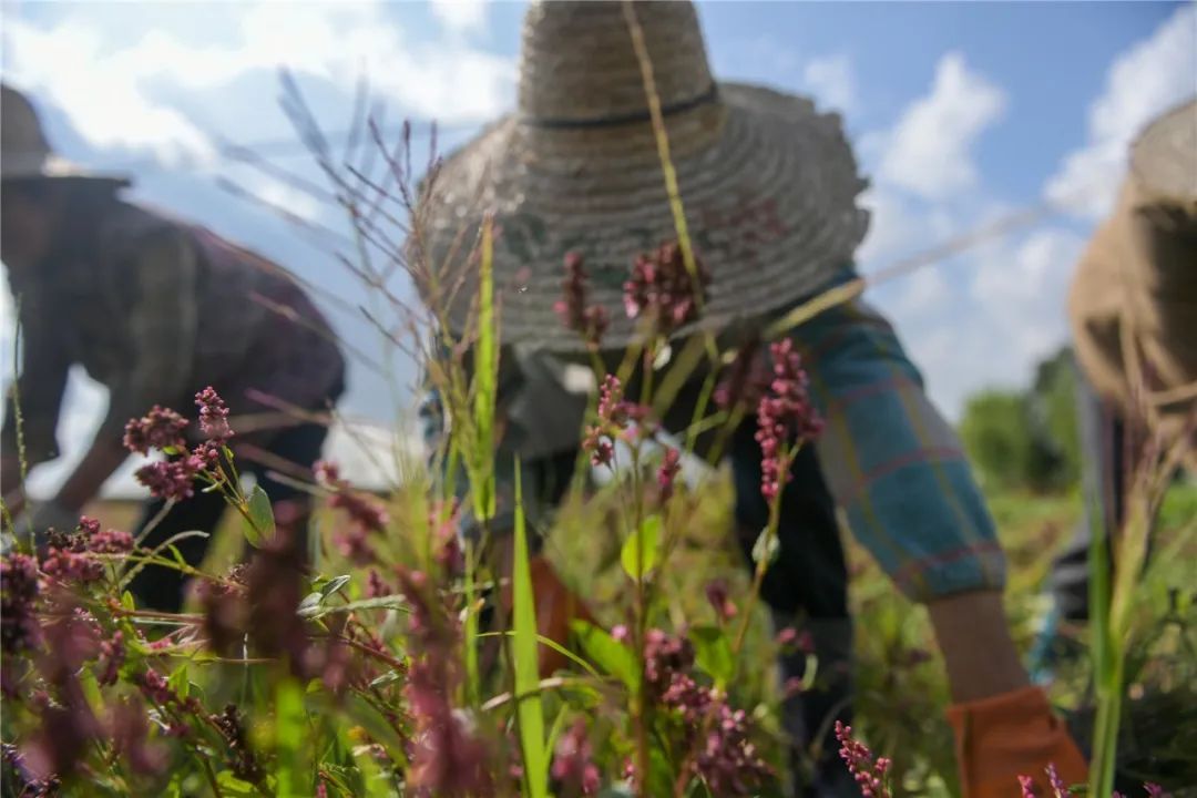 日前,上海爱普香料植物园种植的8亩多蓼蓝迎来了收割季,放眼望去,一片红绿相间的景象。蓼蓝,就是“蓝靛泥”的主要原材料之一。