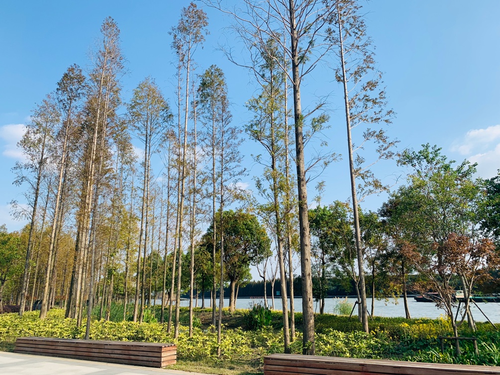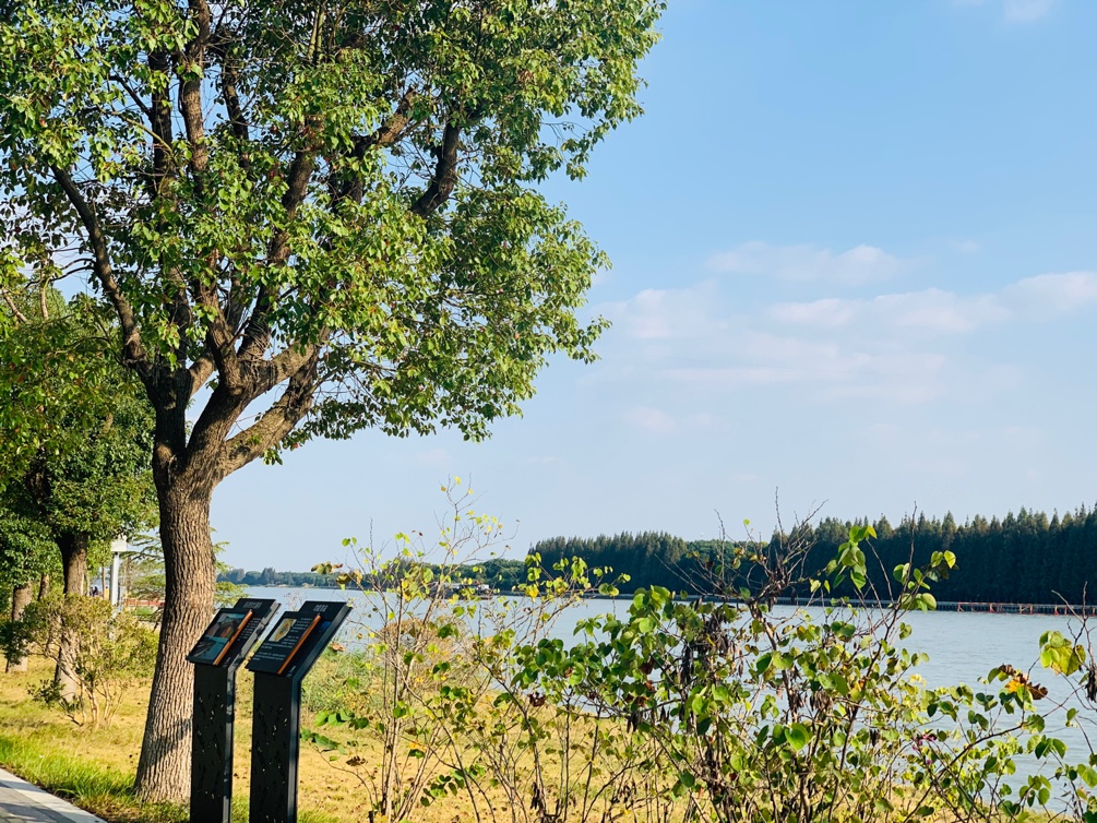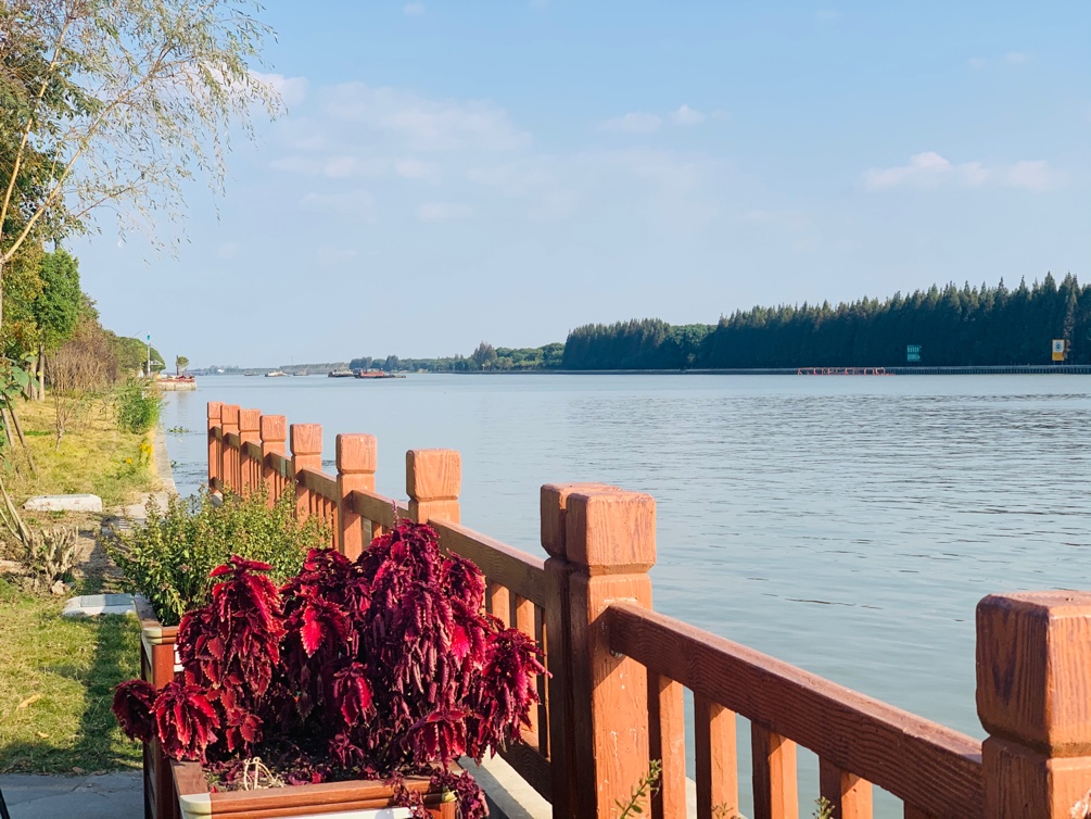 在太浦河边,水清岸绿,微风在河面荡起层层涟漪,烂漫秋日下,满目美景尽收眼底。