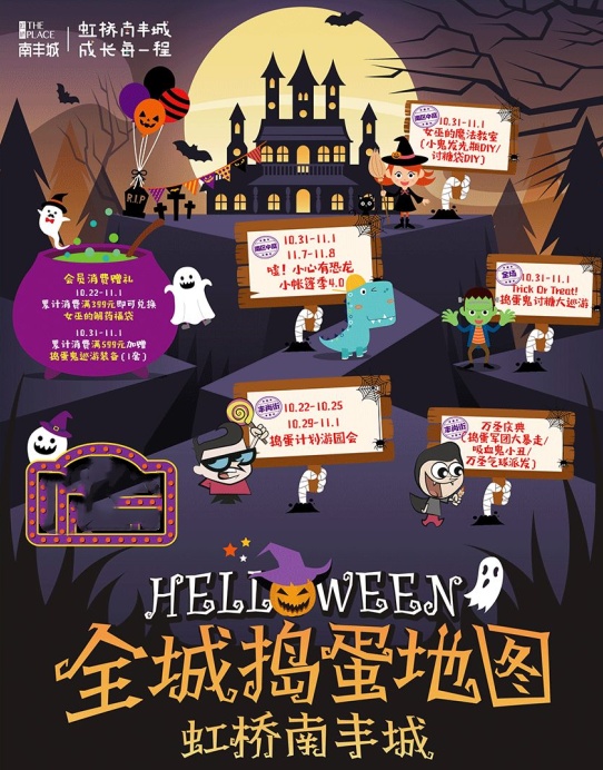 万圣节最开心的莫过于可以光明正大、肆无忌惮地捣蛋,虹桥南丰城准备了:极限逃脱、超级破坏王、疯狂蜘蛛、南瓜弹射、万圣MVP、捣蛋鬼乐园等超过9个捣蛋计划,等你来挑战,挑战成功就可以兑换魔法礼物哦!小心有恐龙小帐篷4.0万圣节专场也来啦,万圣南瓜、蛛丝布景、纸灯笼......8大恐龙营地任务挑战以及爱心集市,让小朋友在历险的同时,感受万圣节的奇妙氛围。除此之外,还有捣蛋鬼讨糖大巡游、万圣节小鬼创意坊、捣蛋军团万圣演出等超多超丰富的活动,等你来参加哦!
