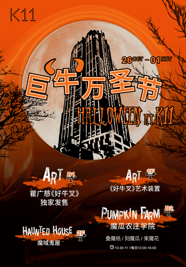 稀奇艺术-2021年牛系列艺术作品《好牛叉》牛艺术即将于万圣节期间重磅上线,2米高的「牛牛」作品也将提前空降K11与你互动!在魔瓜农庄庄主的后院中,一场鬼怪盛宴即将上演;2F互动空间还有神秘“鬼屋”,够胆你就来!女巫、黑猫、南瓜人也将纷纷齐聚上海K11,带上伙伴和糖果一起探秘k 11万圣之夜,享受“魔吃嗨购”的奇妙乐趣吧!