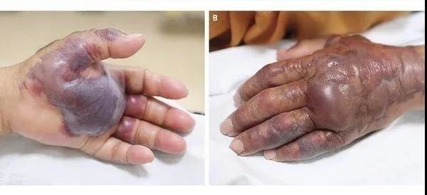原发性脓毒症:常见于生食贝类海鲜后,细菌通过消化道入血,继发脓毒症。主要表现包括急性发热、寒战、休克和典型血性大疱样皮损,水疱进展迅速,数小时内可累及整个下肢,乃至躯干。原发性脓毒症患者多于48小时内进展为脓毒性休克及多脏器功能衰竭,病死率超过50%;