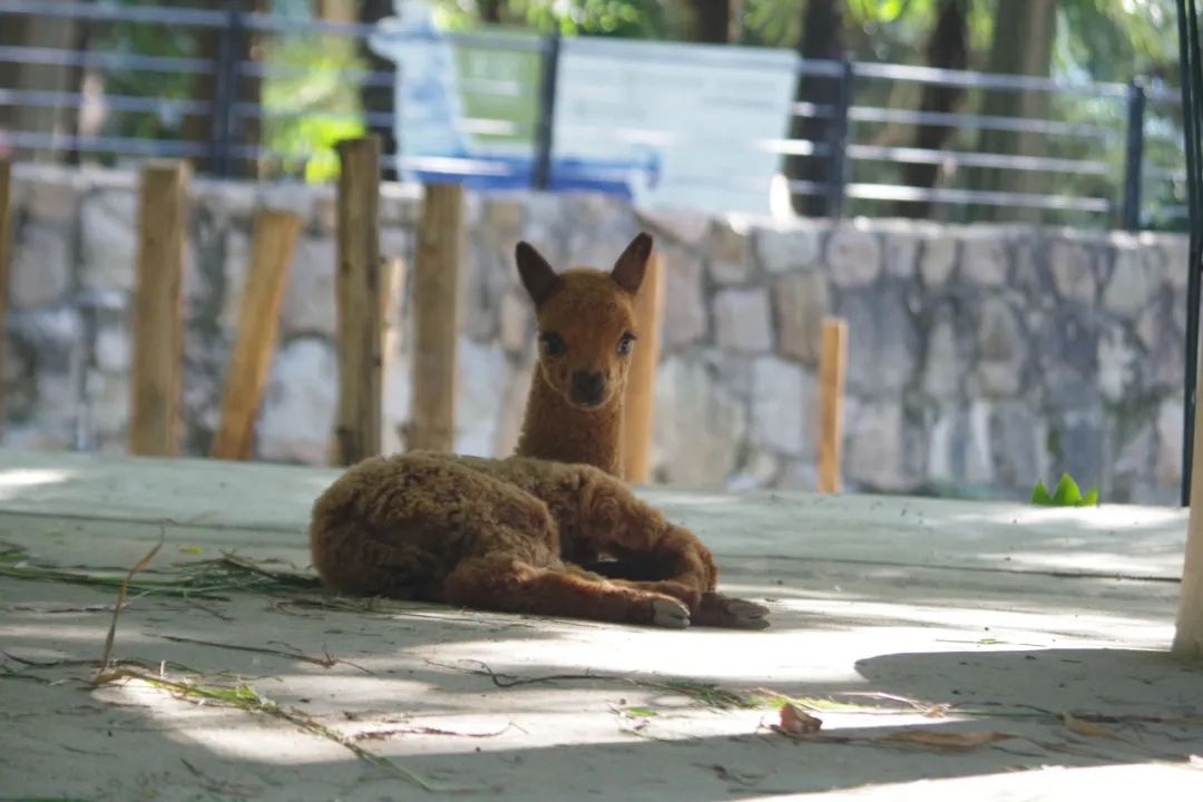 羊驼妈妈母性较好,小崽出生后,快速打理干净幼崽身体,并摆好姿势等待小崽吃奶。经过妈妈一个多月的细心照顾,目前小羊驼的个头已经长到了70cm,可以在笼舍里来回小跑啦。