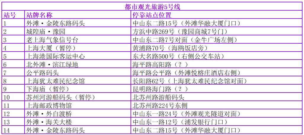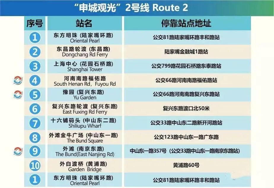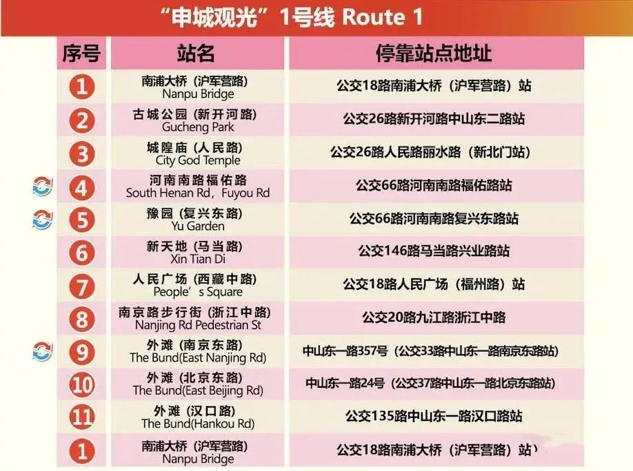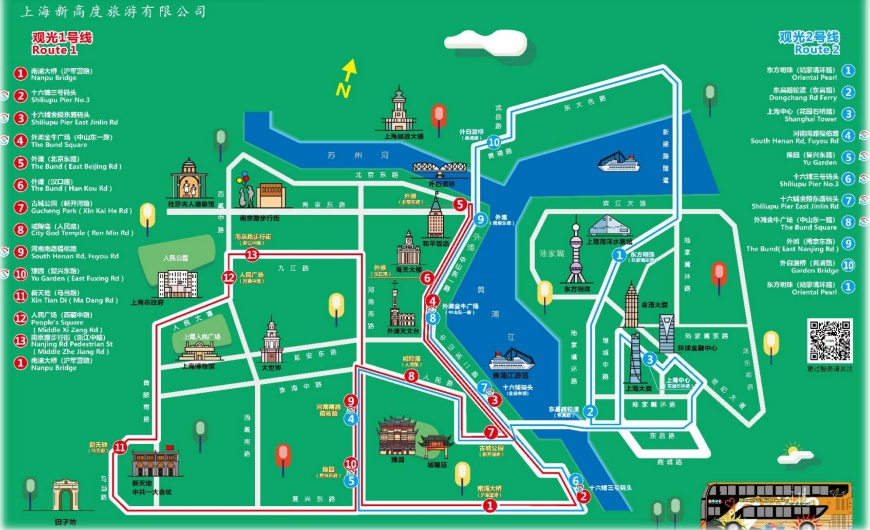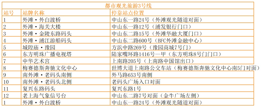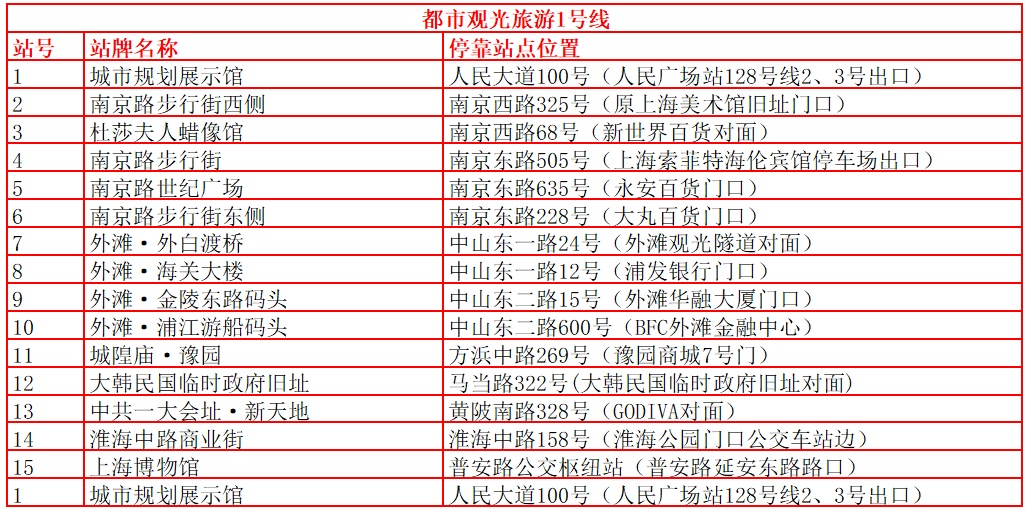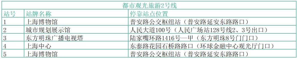| 都市观光旅游巴士共设有观光旅游1、2、3、5号。沿途停靠30余个站点,串联起多个上海市区著名景观。