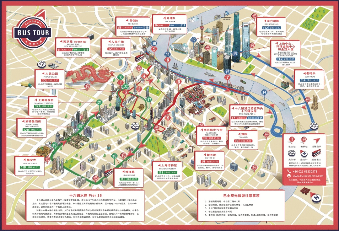 上海城市游(红线):人民广场‧ 上海美术馆‧ 南京路步行街‧外滩‧十六铺浦江游览码头‧豫园‧新天地。