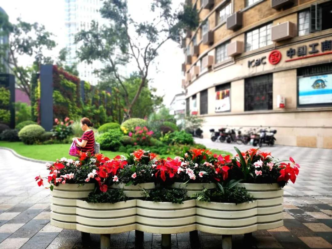 另外,南京西路花街采用人行护栏花槽(桶)加景观双层花槽的搭配,人行花槽中满种亮红色圣诞花,花桶中种植凤梨加矮牵牛,双层景观花槽中,上层种植红双喜杜鹃加凤尾蕨,下层种植粉色西洋鹃;北京西路采用滴水观音、西洋鹃、圣诞花、多头小菊的组合搭配;延安西路采用变叶木、繁星花、比格海棠和一串红。本次花卉布置主色调以红色为主,注重色系搭配,形成不同层次,营造喜庆祥和的盛会气氛。