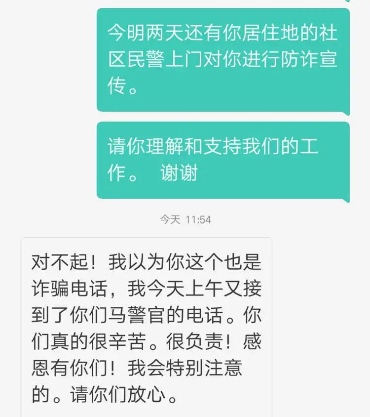 次日上午,社区民警马世岳拿到防范宣传回访单后,与戴女士再次取得了联系,经过多次沟通终于成功上门见面,对方这时终于认识到打电话劝阻的是真警察,并对民警坚持不懈的劝阻表示感谢和肯定。