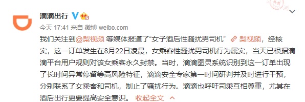 我们关注到媒体报道了“女子酒后性骚扰男司机”,经核实,这一订单发生在8月22日凌晨,女乘客性骚扰男司机行为属实,当天已根据滴滴平台用户规则对该女乘客永久封禁。