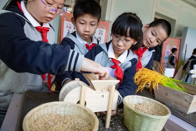 ▲小朋友在体验微型风扬机,可过滤发育不成熟的稻粒。